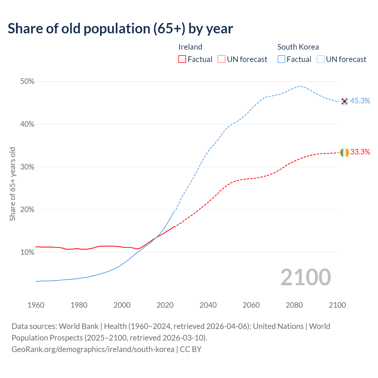 The share of older people aged 65 and over is 15.9% in Ireland and 19.3% in South Korea. Life expectancy in Ireland compared to South Korea .