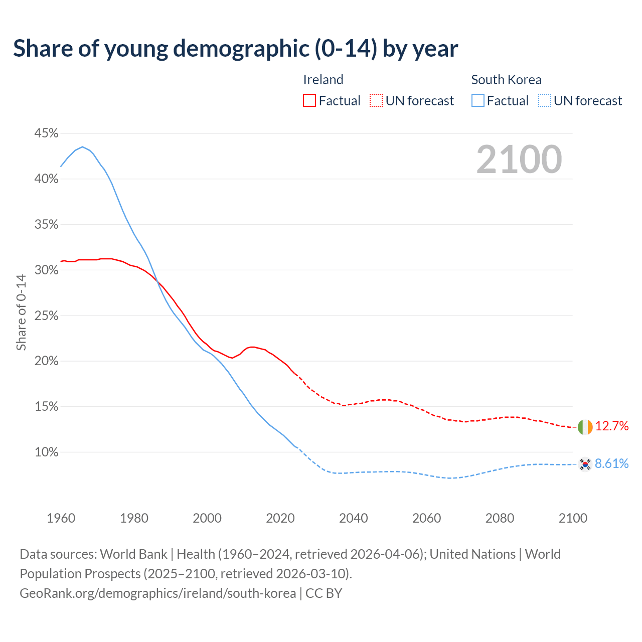 - The share of young demographic (0-15 years old) in Ireland is 18.6% vs 10.6% in South Korea.
