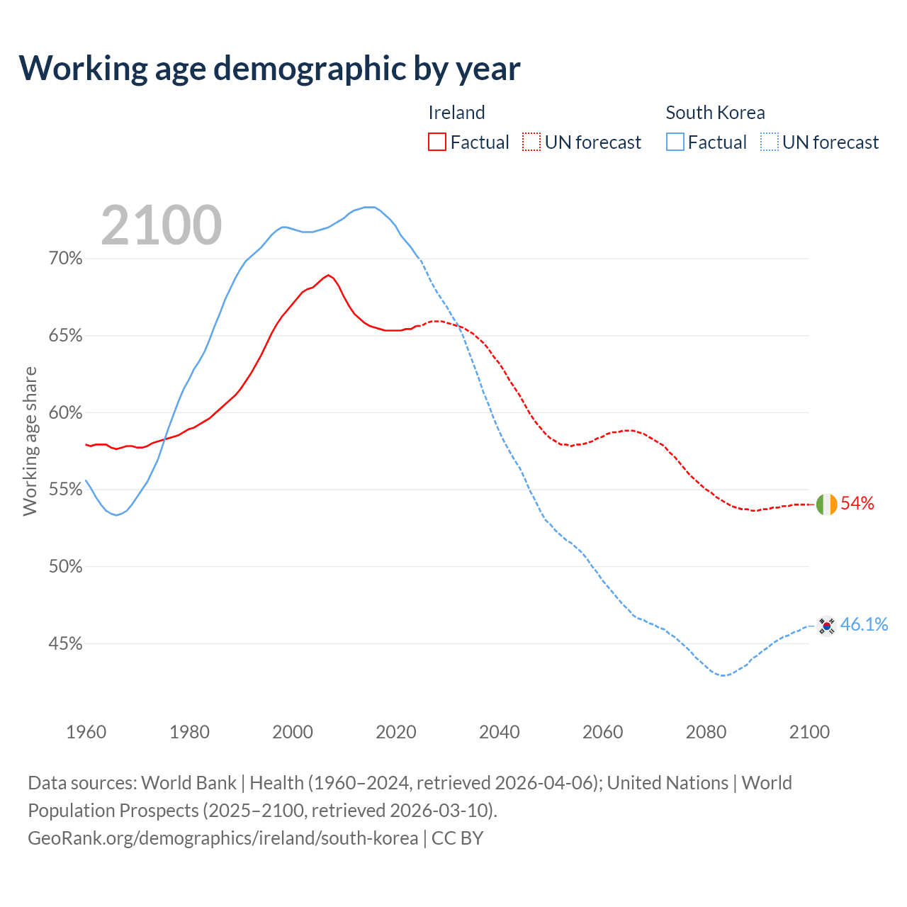 Median age Ireland vs South Korea, 1960-2100