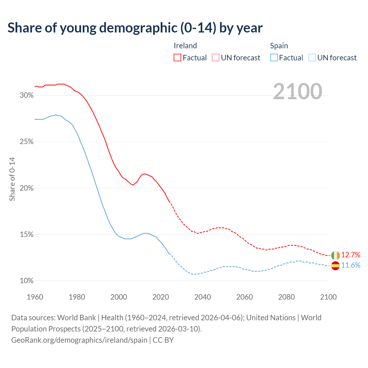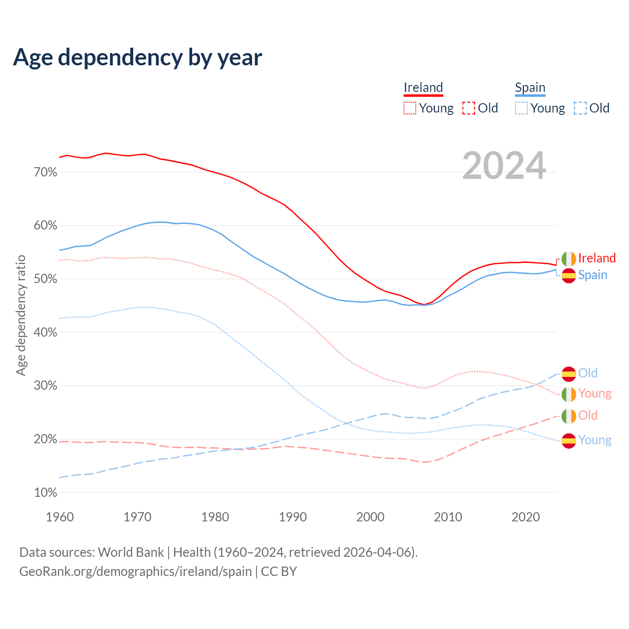 - Ireland is ranked 48/196 by median age (oldest to youngest) vs 7/196 for Spain.