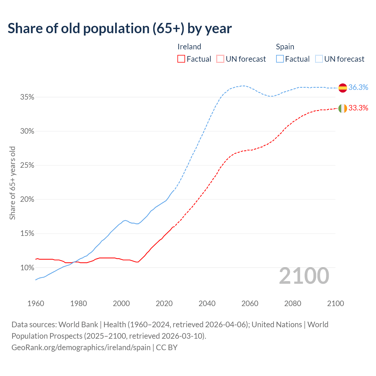 The share of older people aged 65 and over is 15.9% in Ireland and 21.1% in Spain. Life expectancy in Ireland compared to Spain .