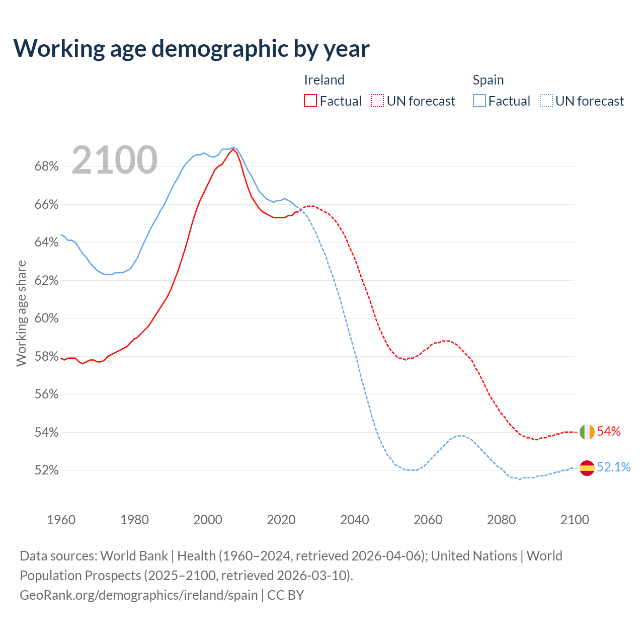 Median age Ireland vs Spain, 1960-2100