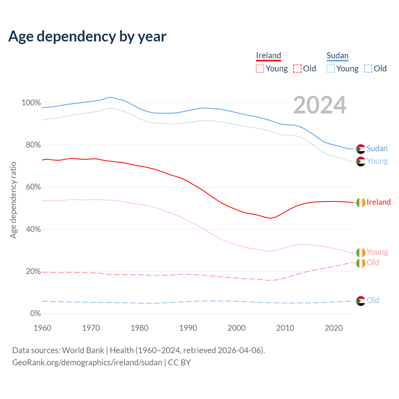 - Ireland is ranked 48/196 by median age (oldest to youngest) vs 172/196 for Sudan.