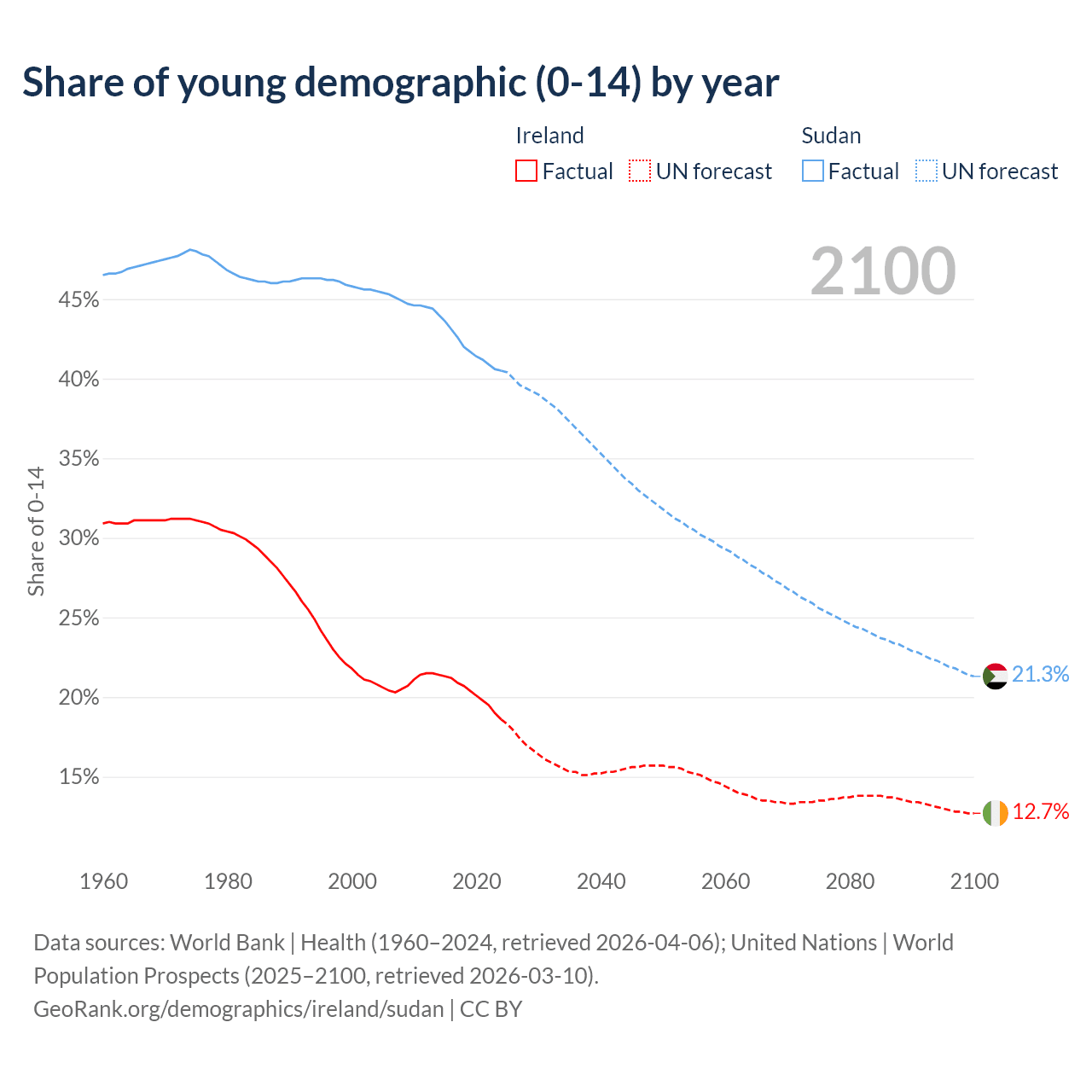 - The share of young demographic (0-15 years old) in Ireland is 18.6% vs 40.5% in Sudan.