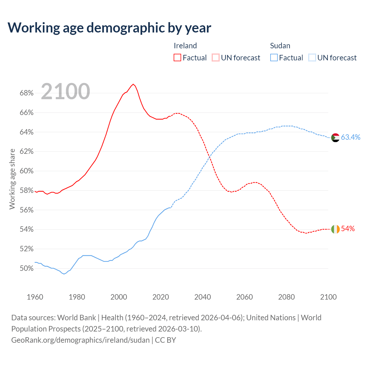 - Ireland has 3.62M working age adults (aged 15-64) vs 30M in Sudan.