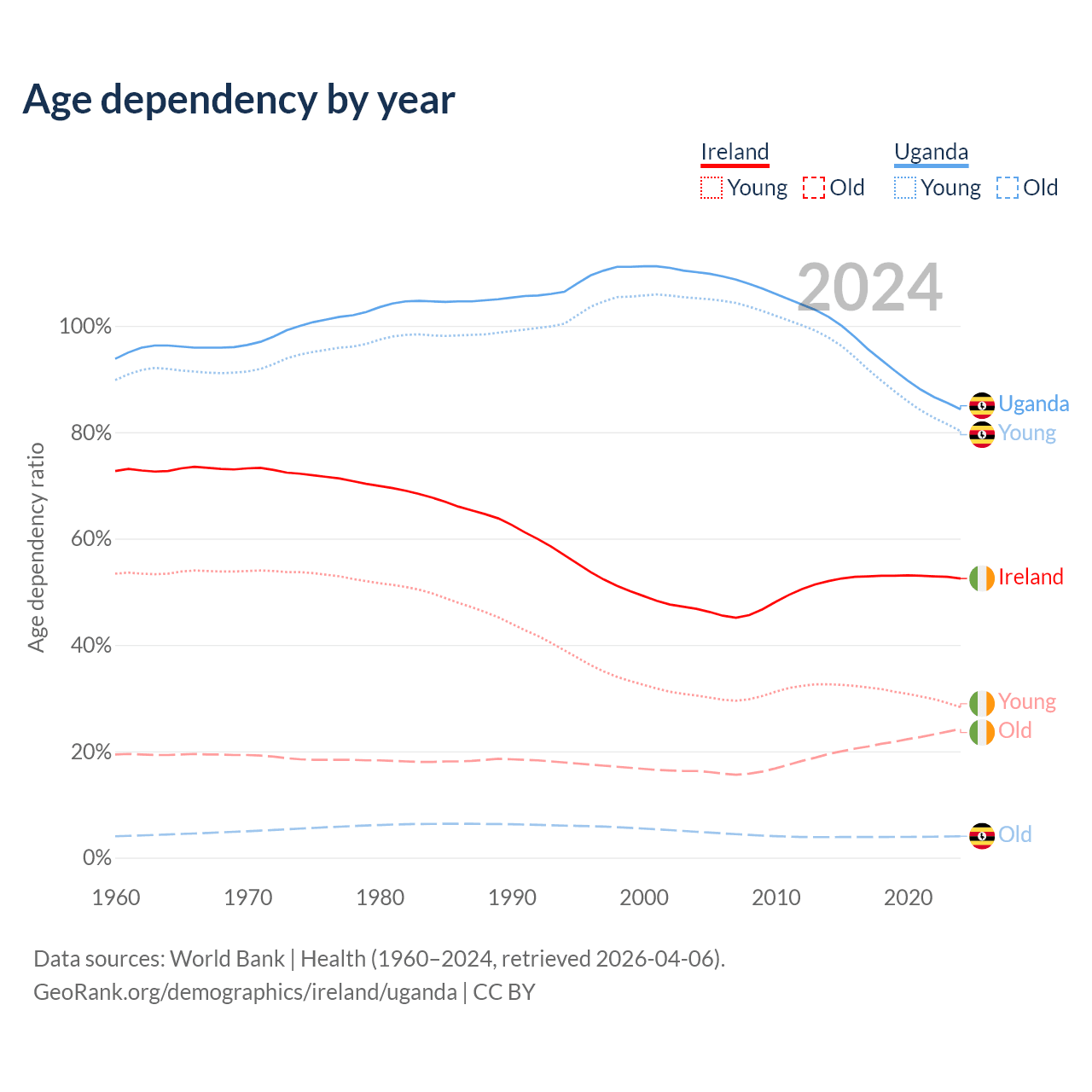 - The share of old-age demographic (65+) in Ireland is 15.9% vs 2.19% in Uganda.