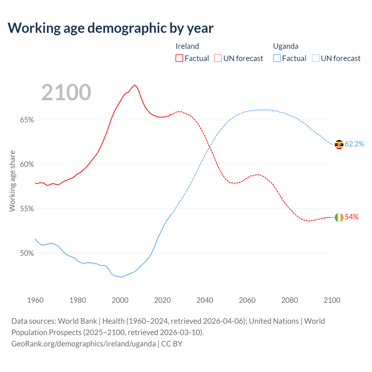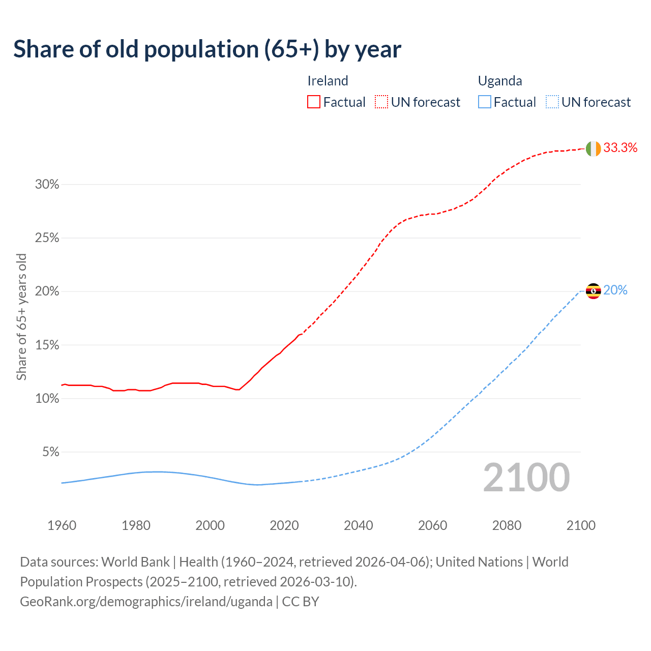 Median age Ireland vs Uganda, 1960-2100