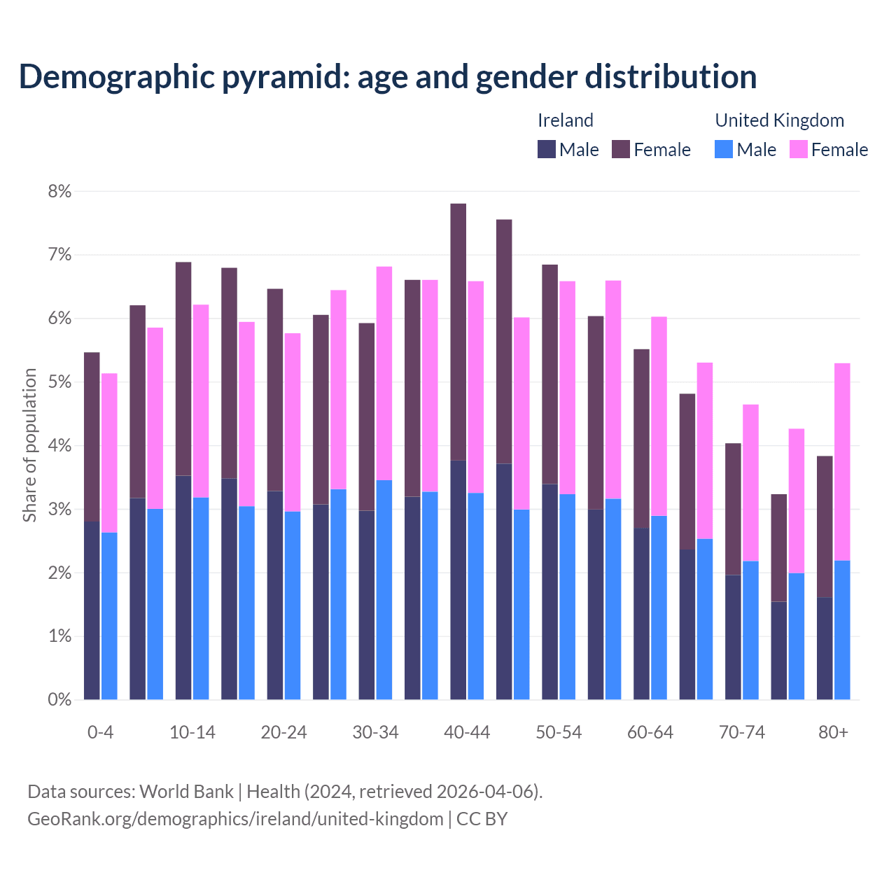 - Ireland is ranked 48/196 by median age (oldest to youngest) vs 41/196 for the United Kingdom.