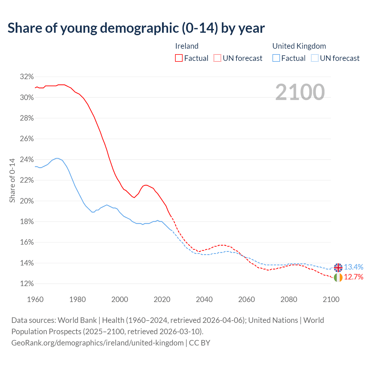 - The share of young demographic (0-15 years old) in Ireland is 18.6% vs 17.2% in the United Kingdom.