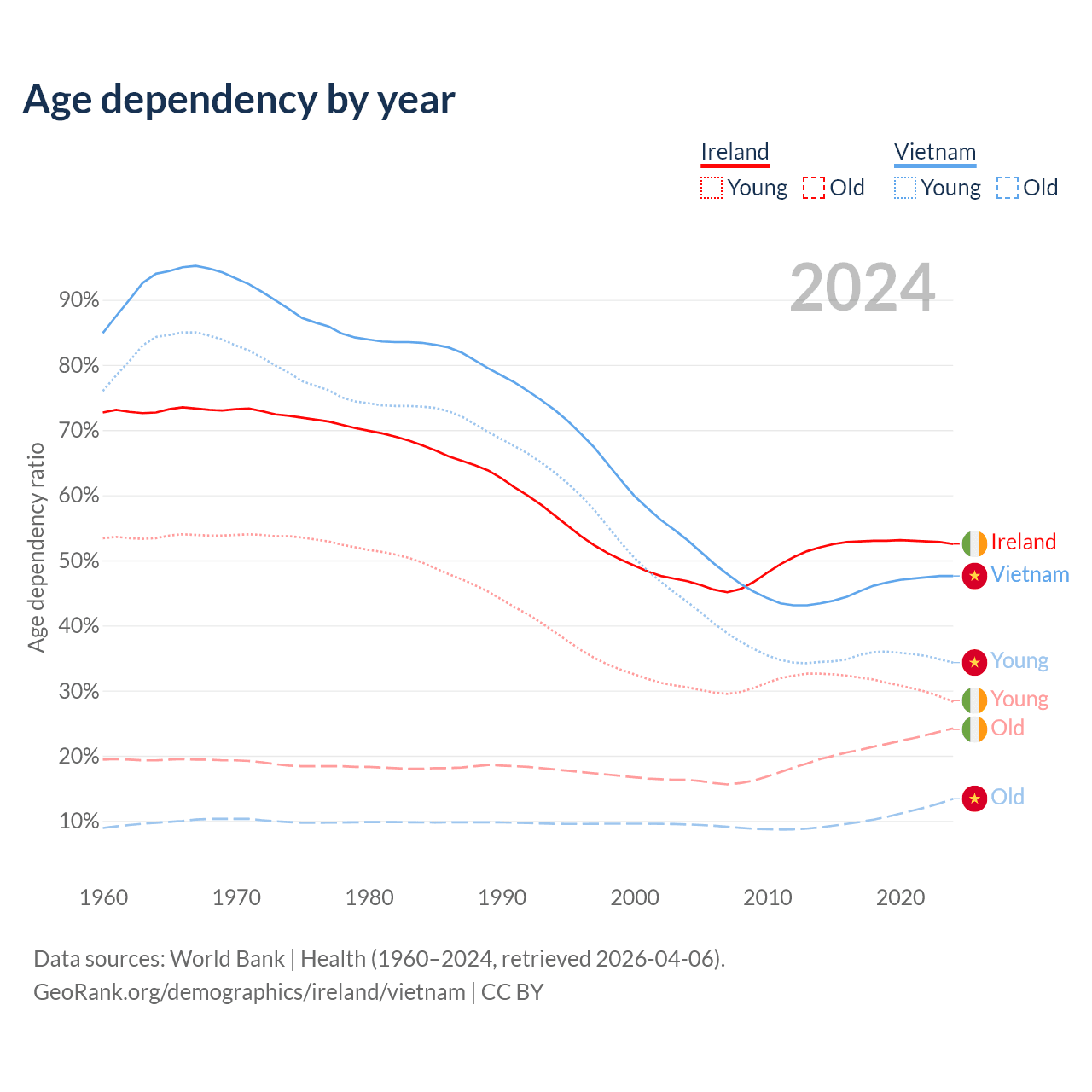 - Ireland is ranked 48/196 by median age (oldest to youngest) vs 84/196 for Vietnam.