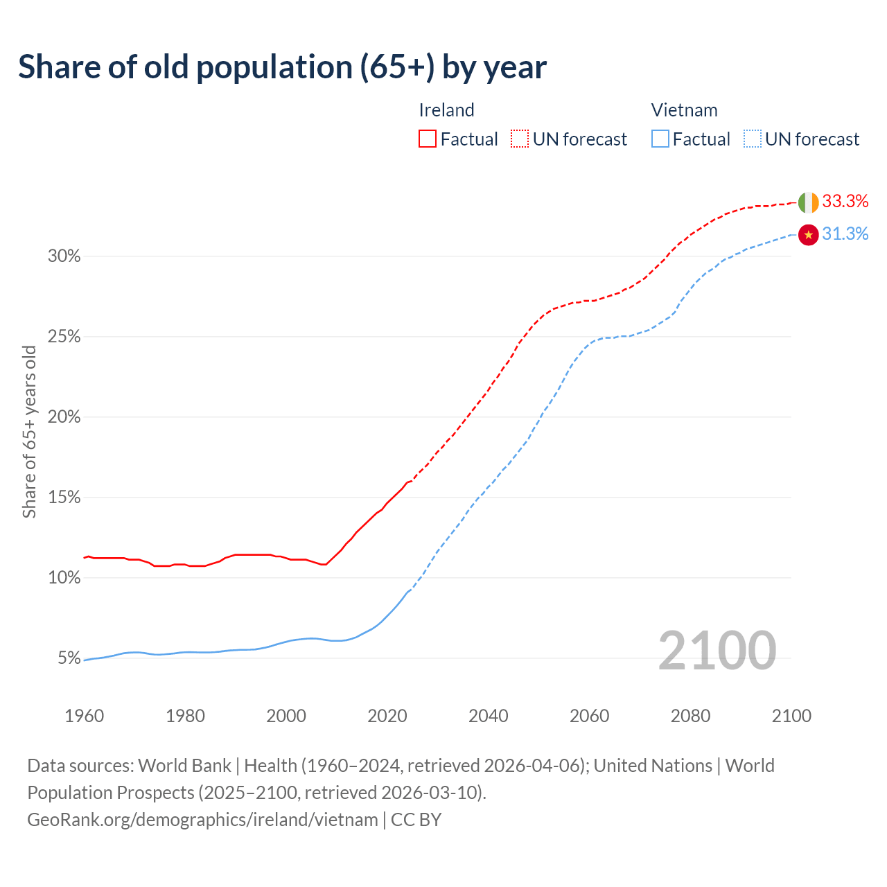 - The share of old-age demographic (65+) in Ireland is 15.9% vs 9.05% in Vietnam.
