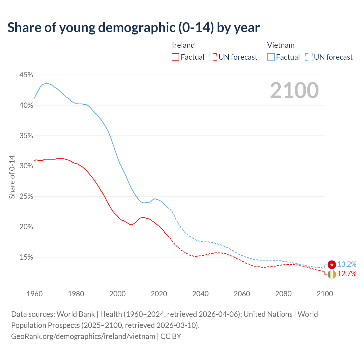 - As of 2026, the population of Ireland is 5.52M vs 102M in Vietnam - 18.5 times difference.