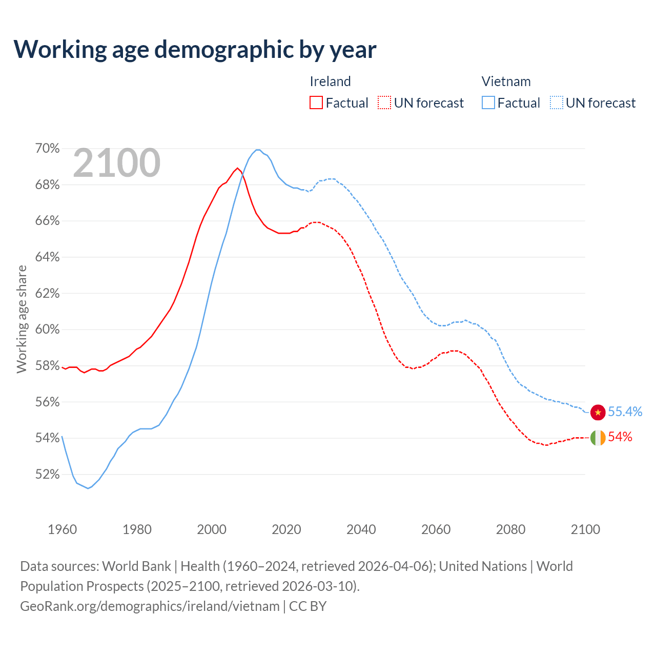 - Ireland has 3.62M working age adults (aged 15-64) vs 69.3M in Vietnam.
