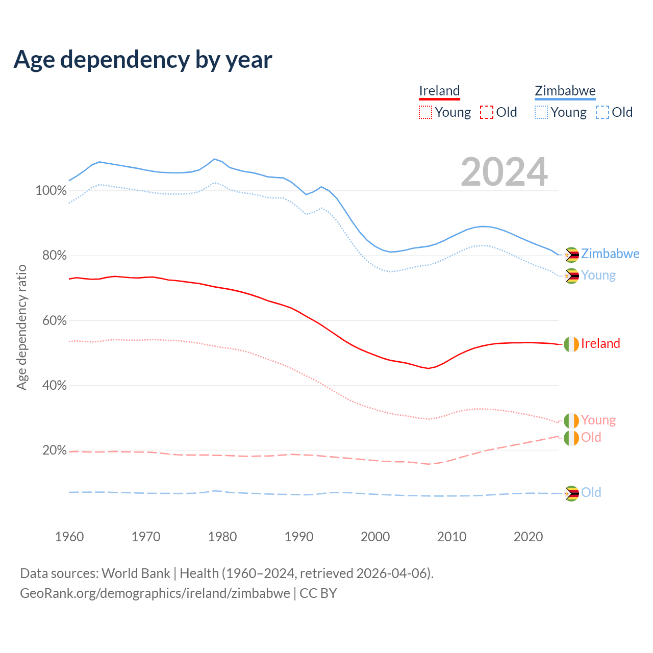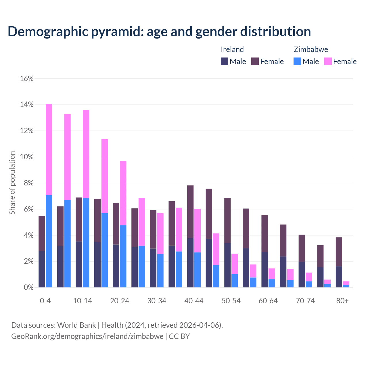 - The share of old-age demographic (65+) in Ireland is 15.9% vs 3.6% in Zimbabwe.