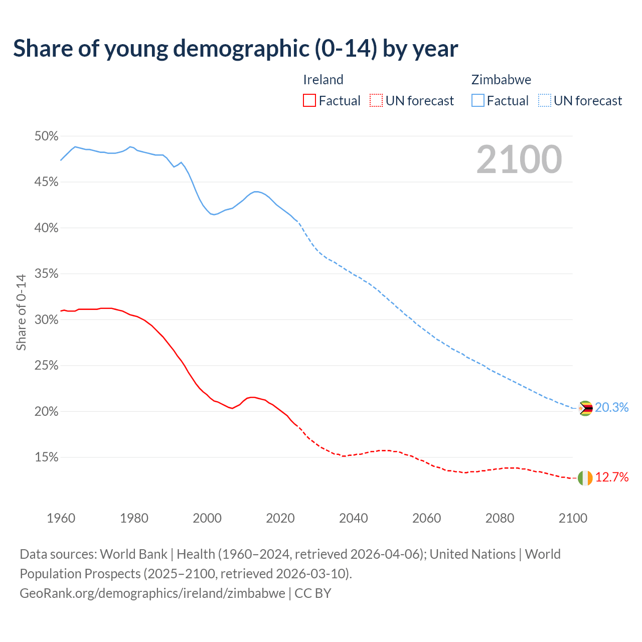 - The share of young demographic (0-15 years old) in Ireland is 18.6% vs 40.9% in Zimbabwe.