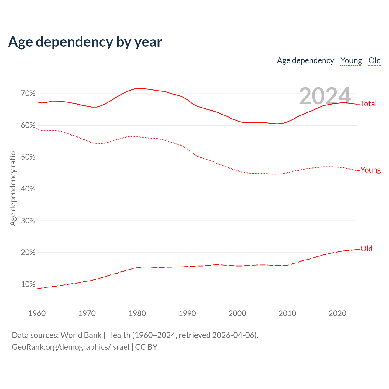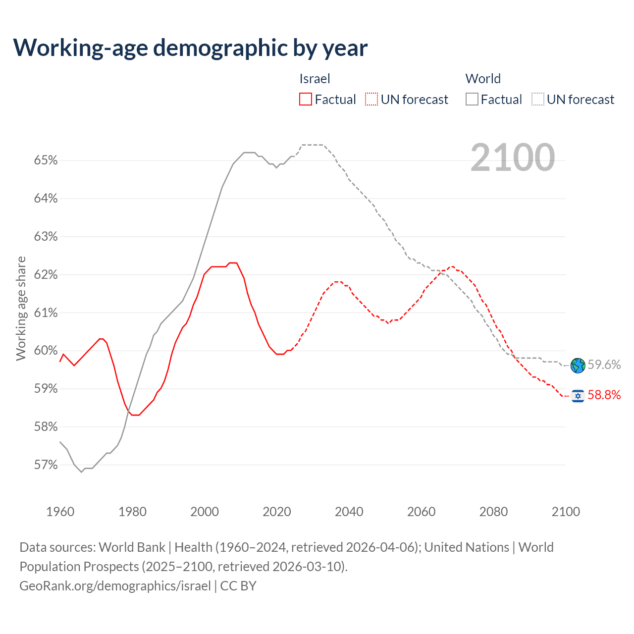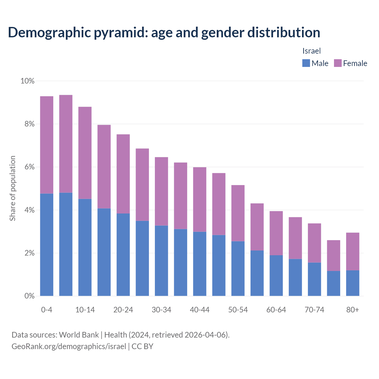 With a population of 9.97M people, Israel has a median age of 30.2 years which makes it the 103/196 oldest country. 27.4% of the demographic are children 0-14 years old, 60% are working-age people aged 15-64, and 12.6% are older population aged 65+ years.