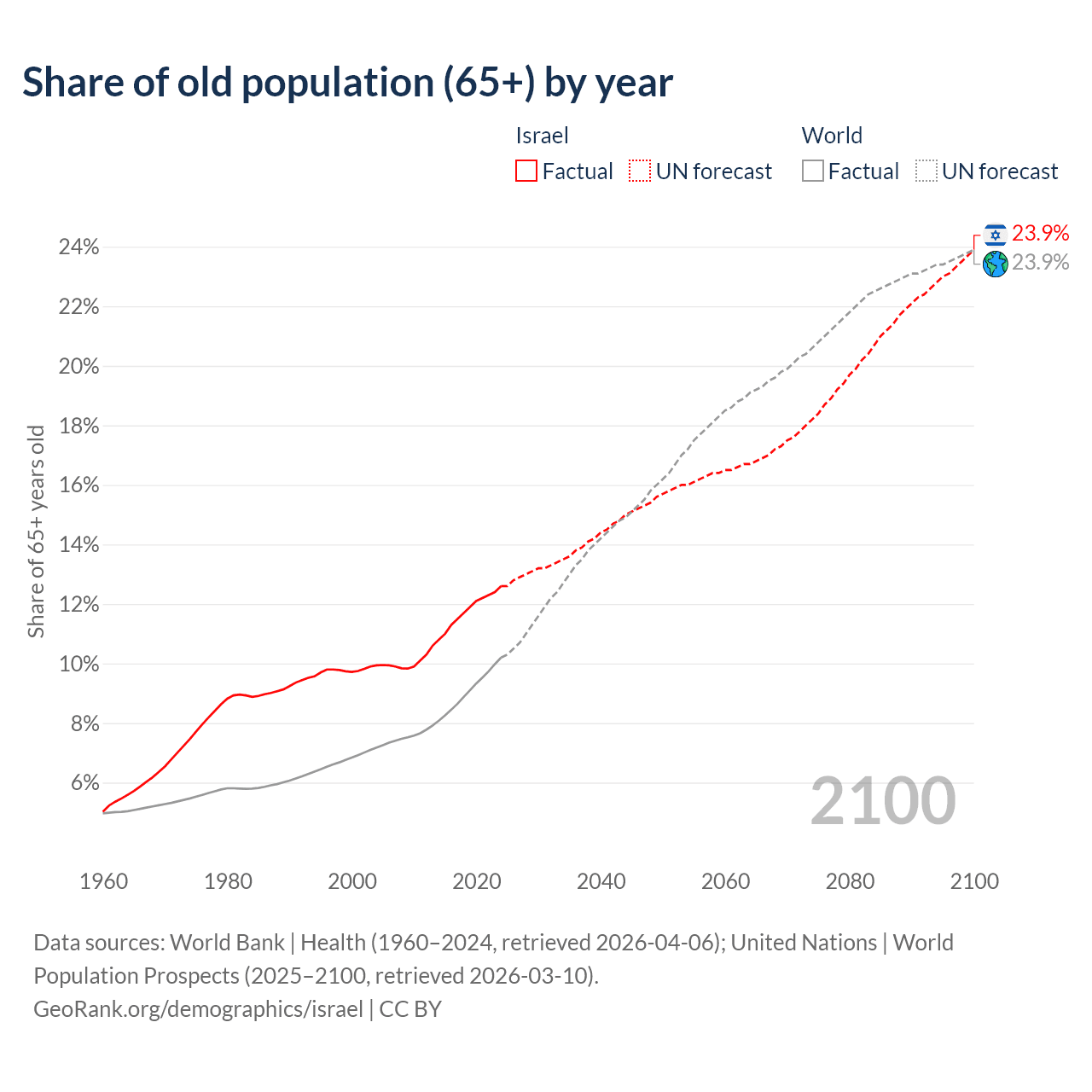 The share of older people aged 65 and over in Israel increased from 9.94% to 12.6% between 2004 and 2024.