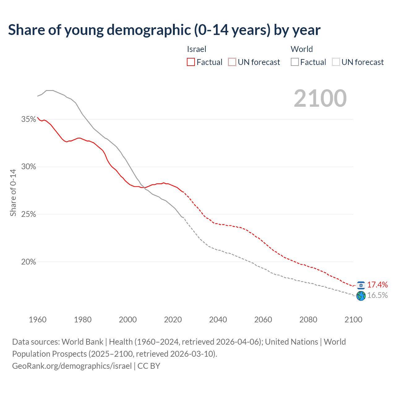 The share of children aged 0-14 in Israel decreased from 27.9% to 27.4% between 2004 and 2024 due to changes in birth rates.