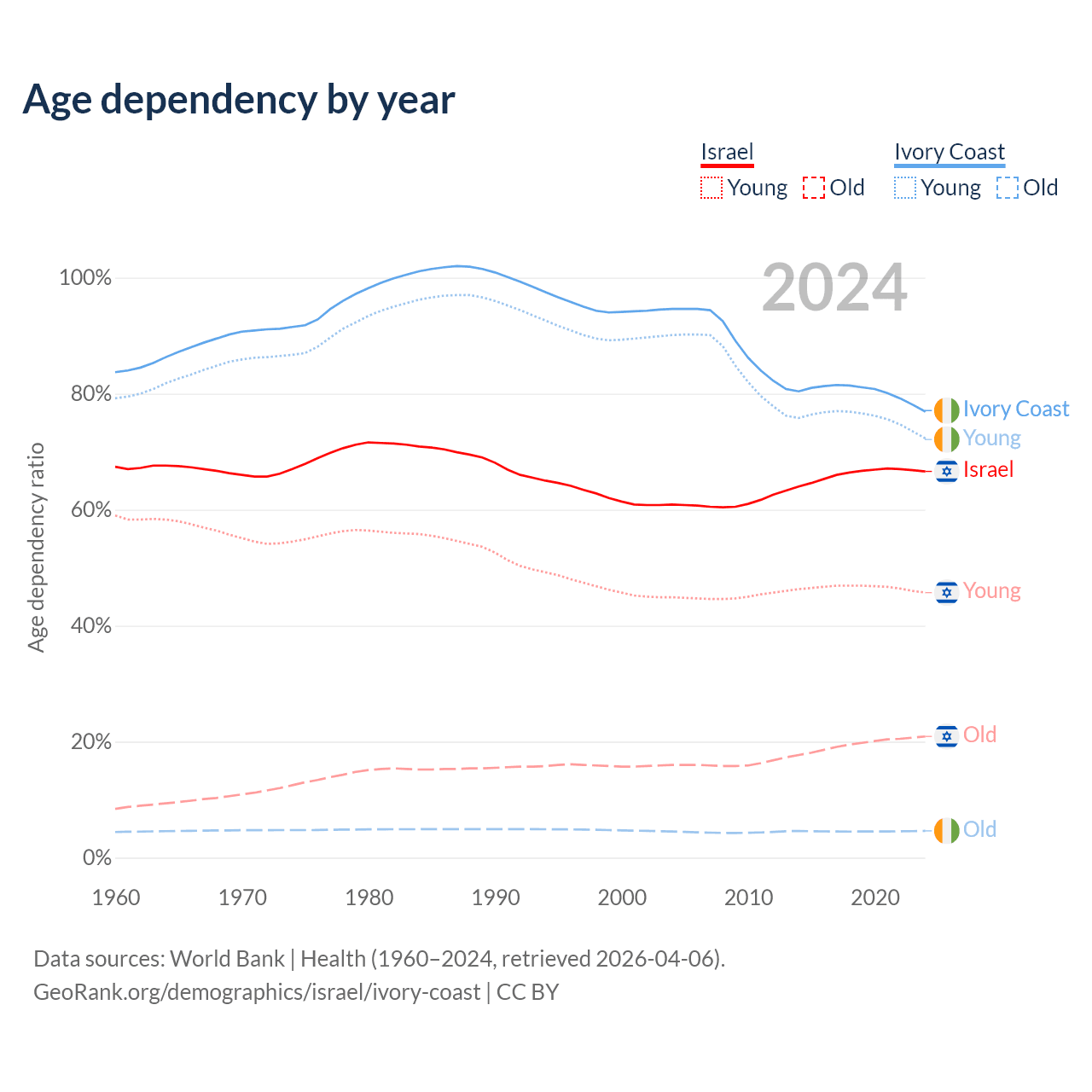 - Israel is ranked 103/196 by median age (oldest to youngest) vs 175/196 for Ivory Coast.