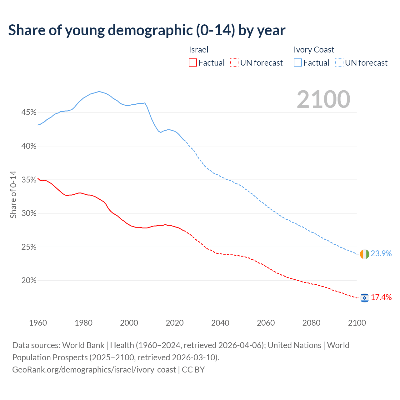 - As of 2026, the population of Israel is 10.3M vs 33.7M in Ivory Coast - 3.28 times difference.