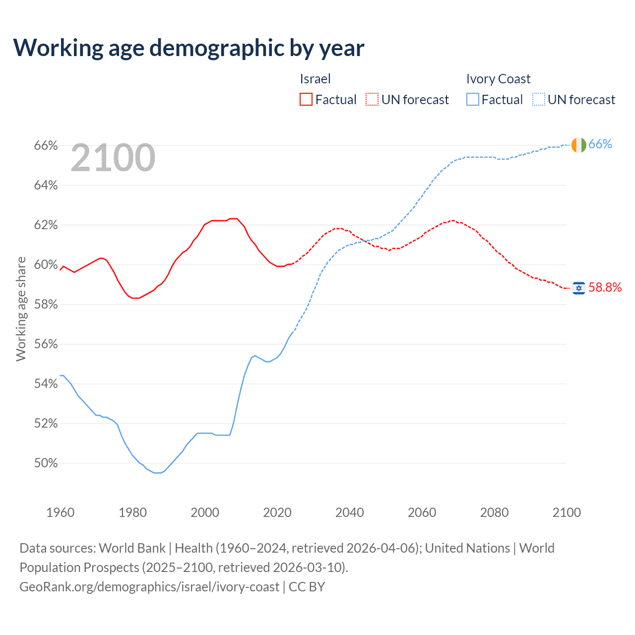 - Israel has 6.18M working age adults (aged 15-64) vs 19.1M in Ivory Coast.