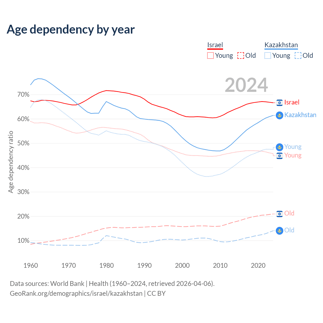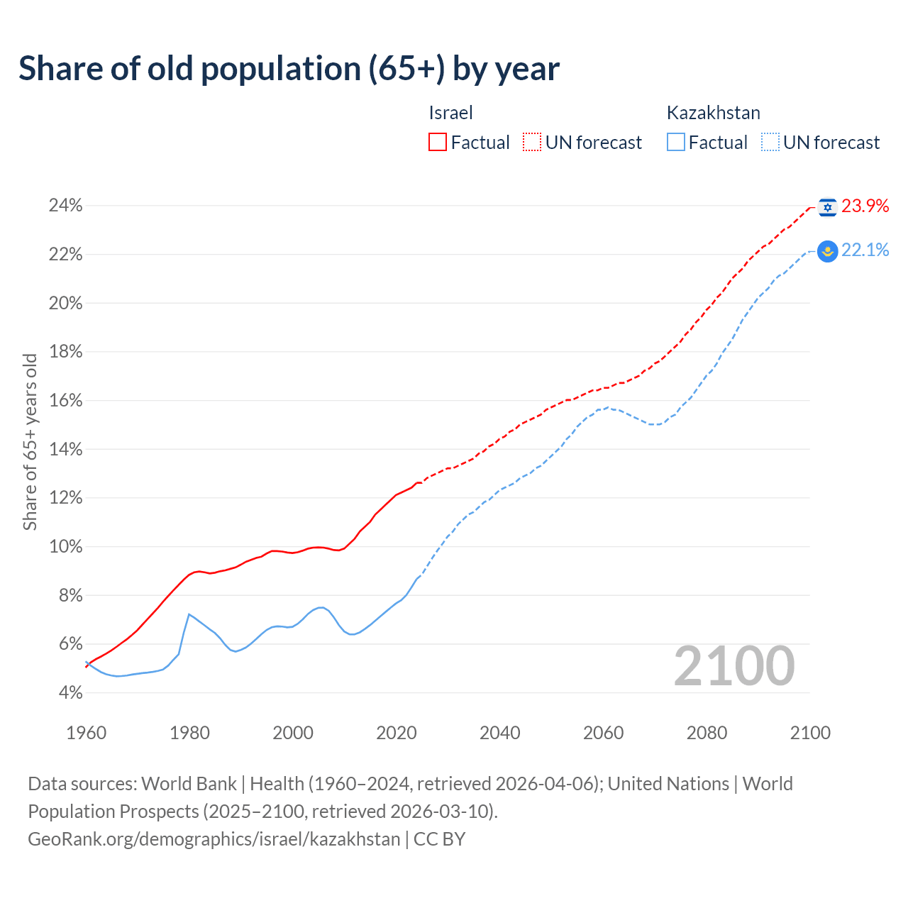 The share of older people aged 65 and over is 12.6% in Israel and 8.65% in Kazakhstan. Life expectancy in Israel compared to Kazakhstan .