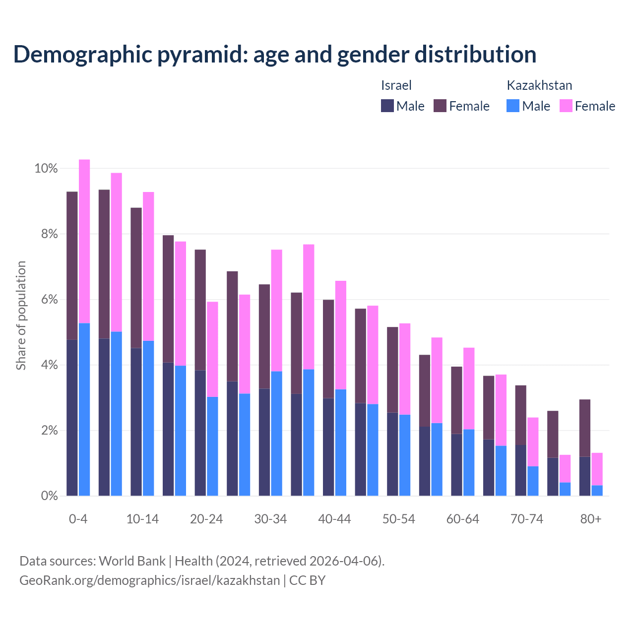 - Israel is ranked 103/196 by median age (oldest to youngest) vs 99/196 for Kazakhstan.
