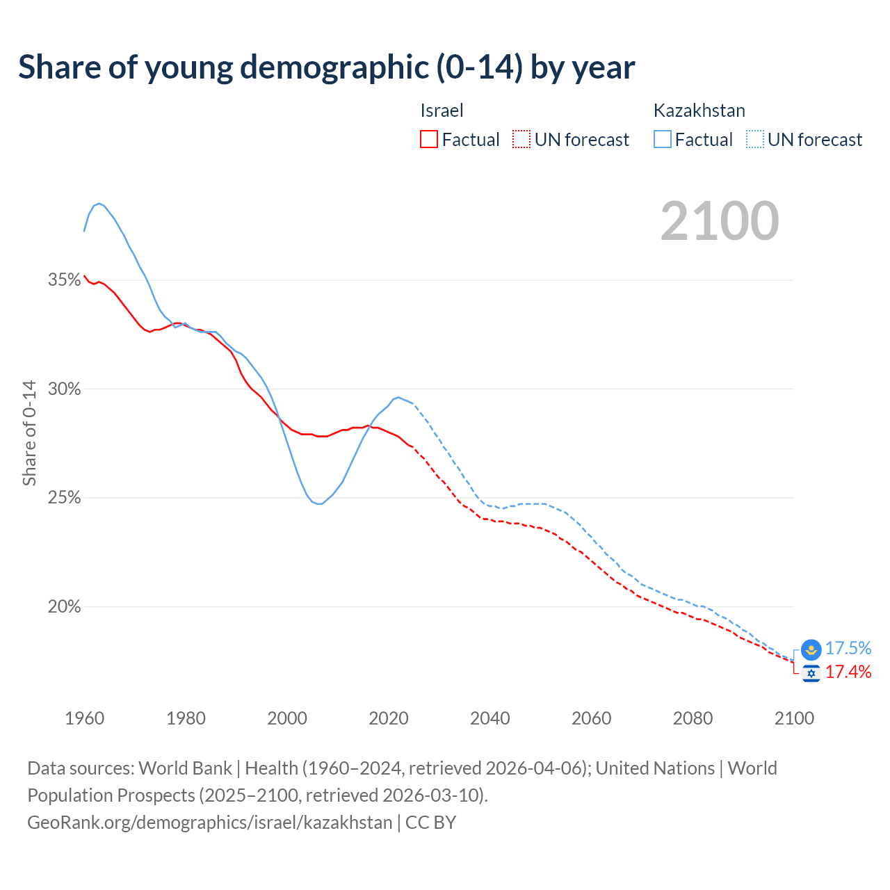 - The share of young demographic (0-15 years old) in Israel is 27.4% vs 29.4% in Kazakhstan.