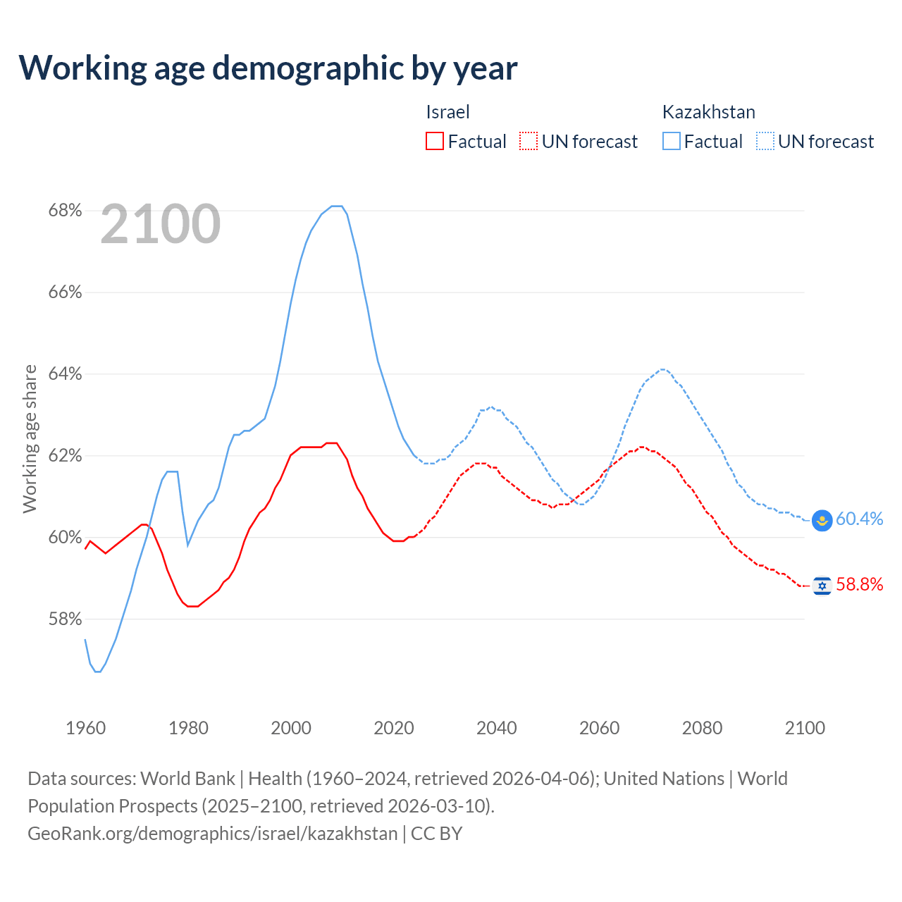- Israel has 6.18M working age adults (aged 15-64) vs 13.1M in Kazakhstan.