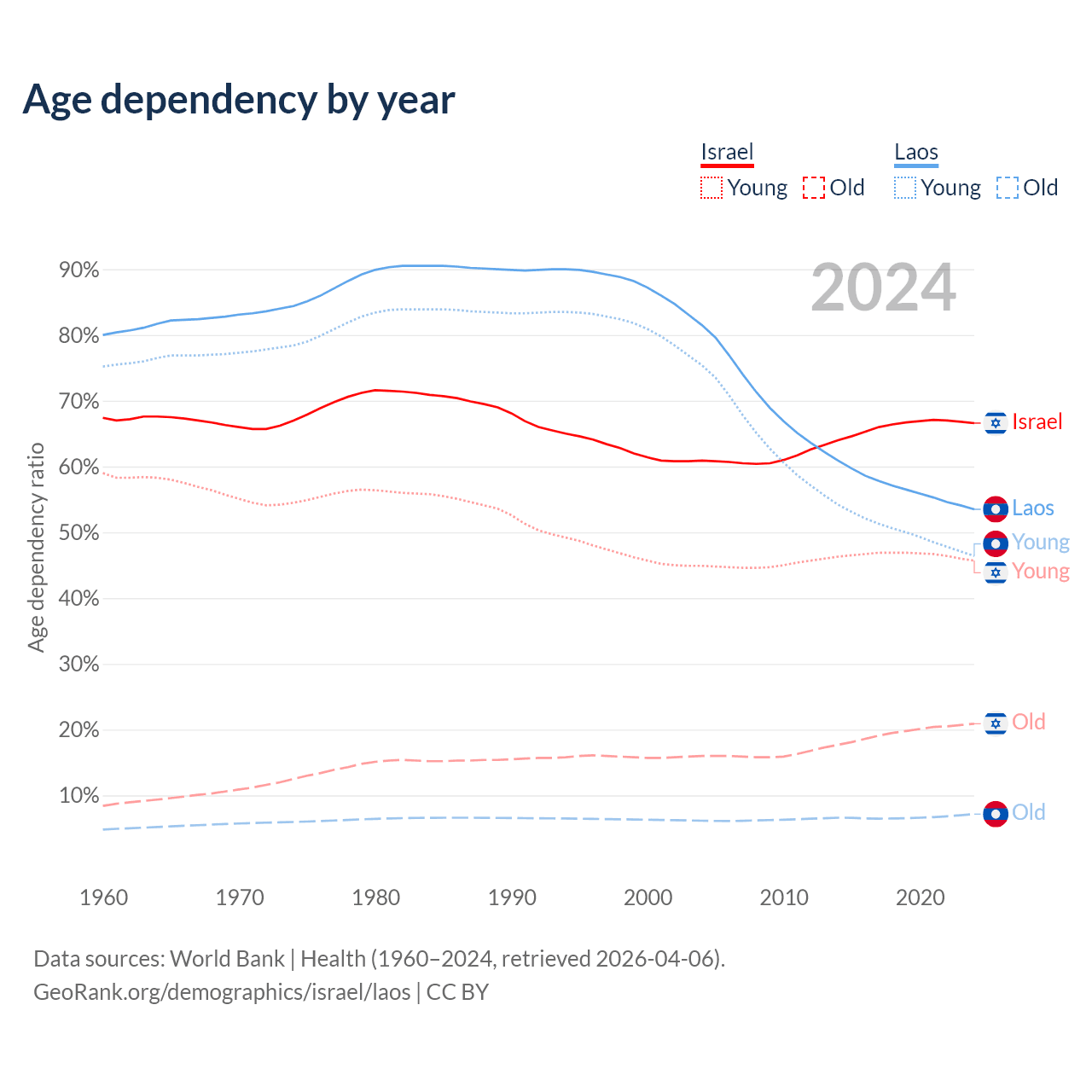 - Israel is ranked 103/196 by median age (oldest to youngest) vs 130/196 for Laos.