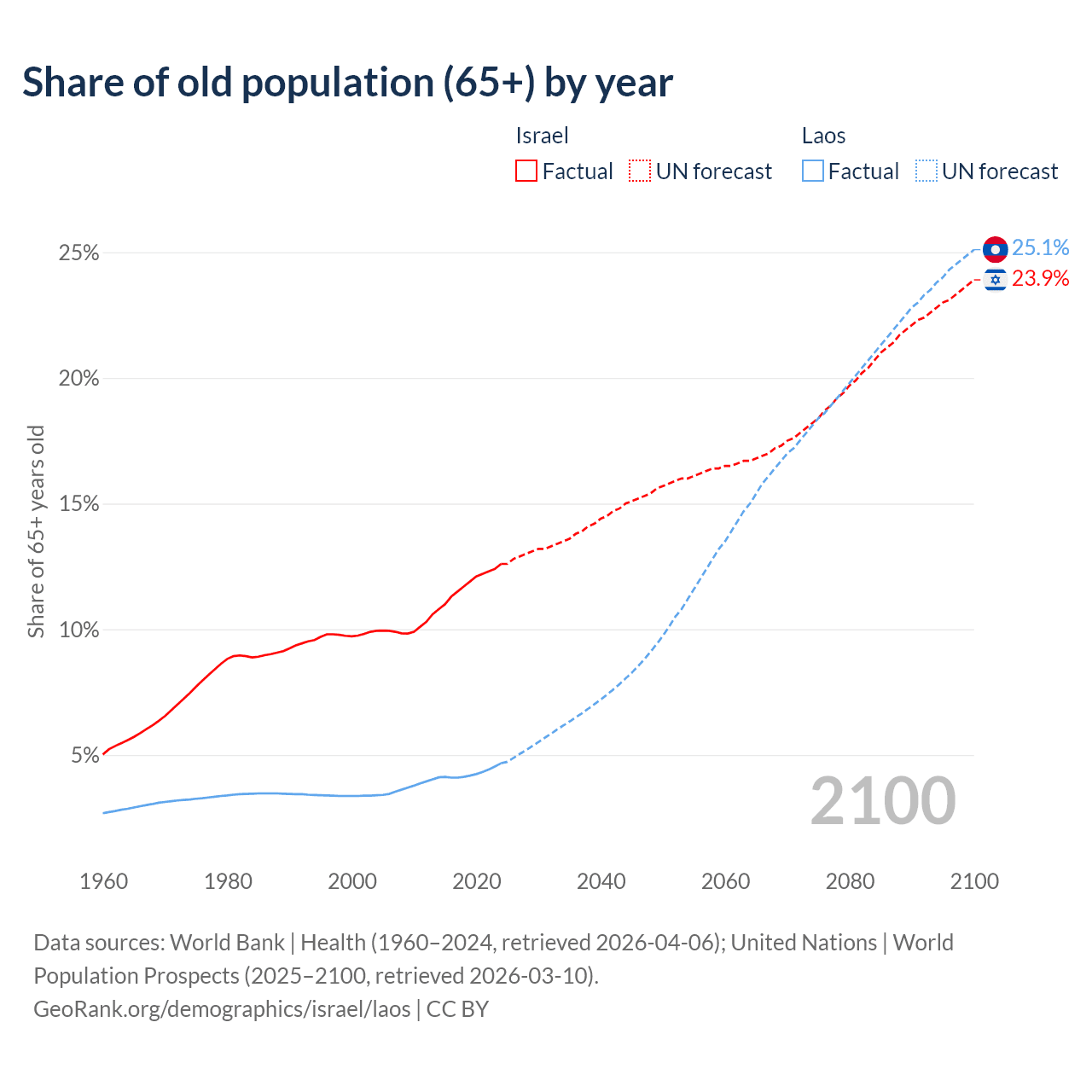 The share of older people aged 65 and over is 12.6% in Israel and 4.67% in Laos. Life expectancy in Israel compared to Laos .