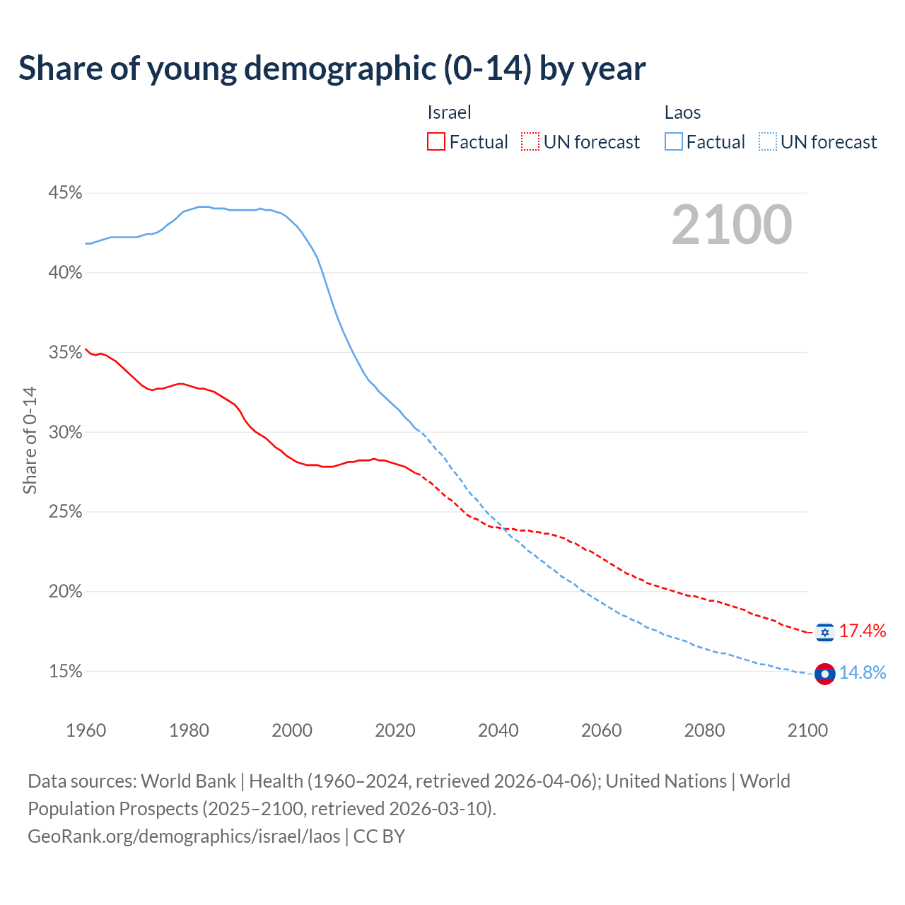 - The share of young demographic (0-15 years old) in Israel is 27.4% vs 30.2% in Laos.