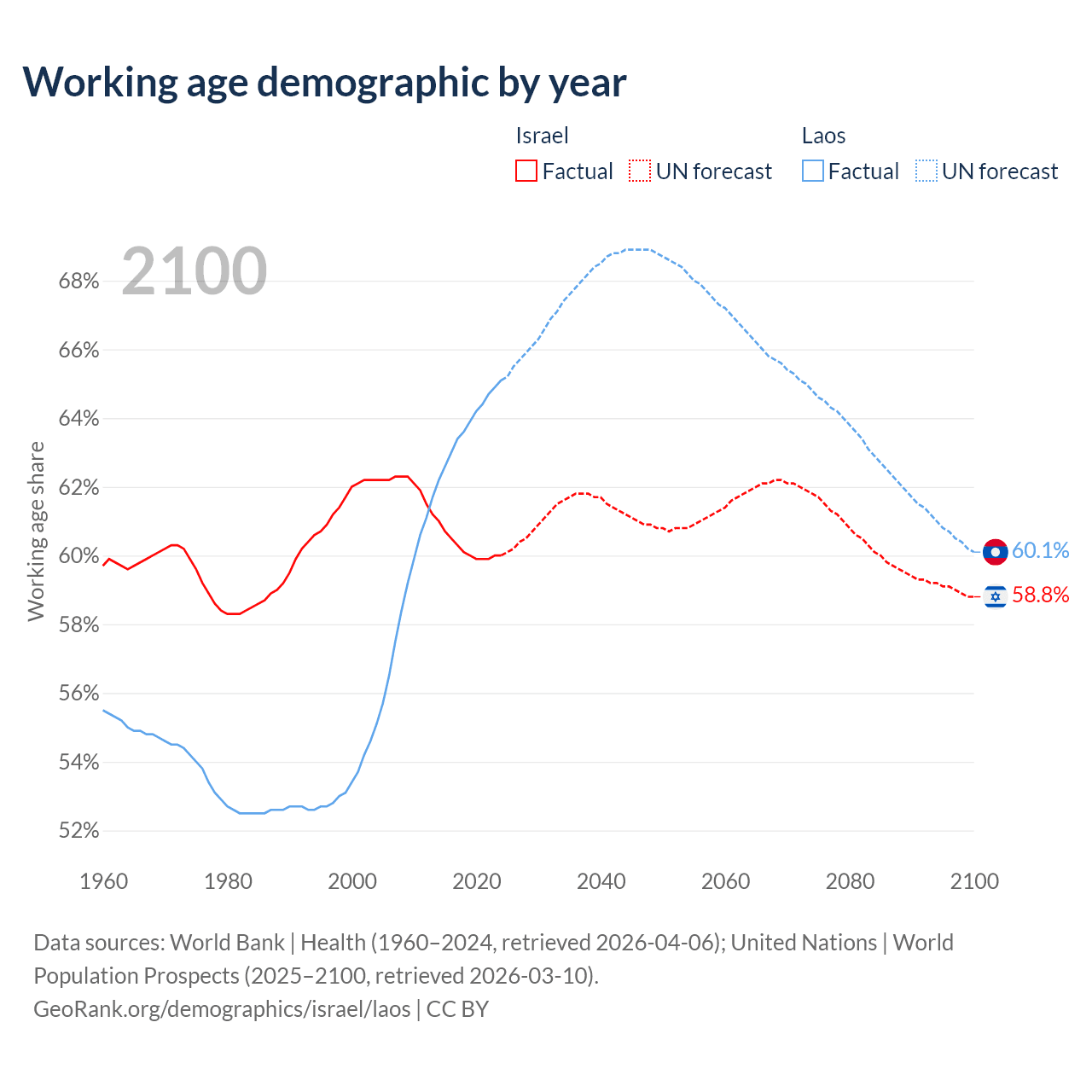 Median age Israel vs Laos, 1960-2100