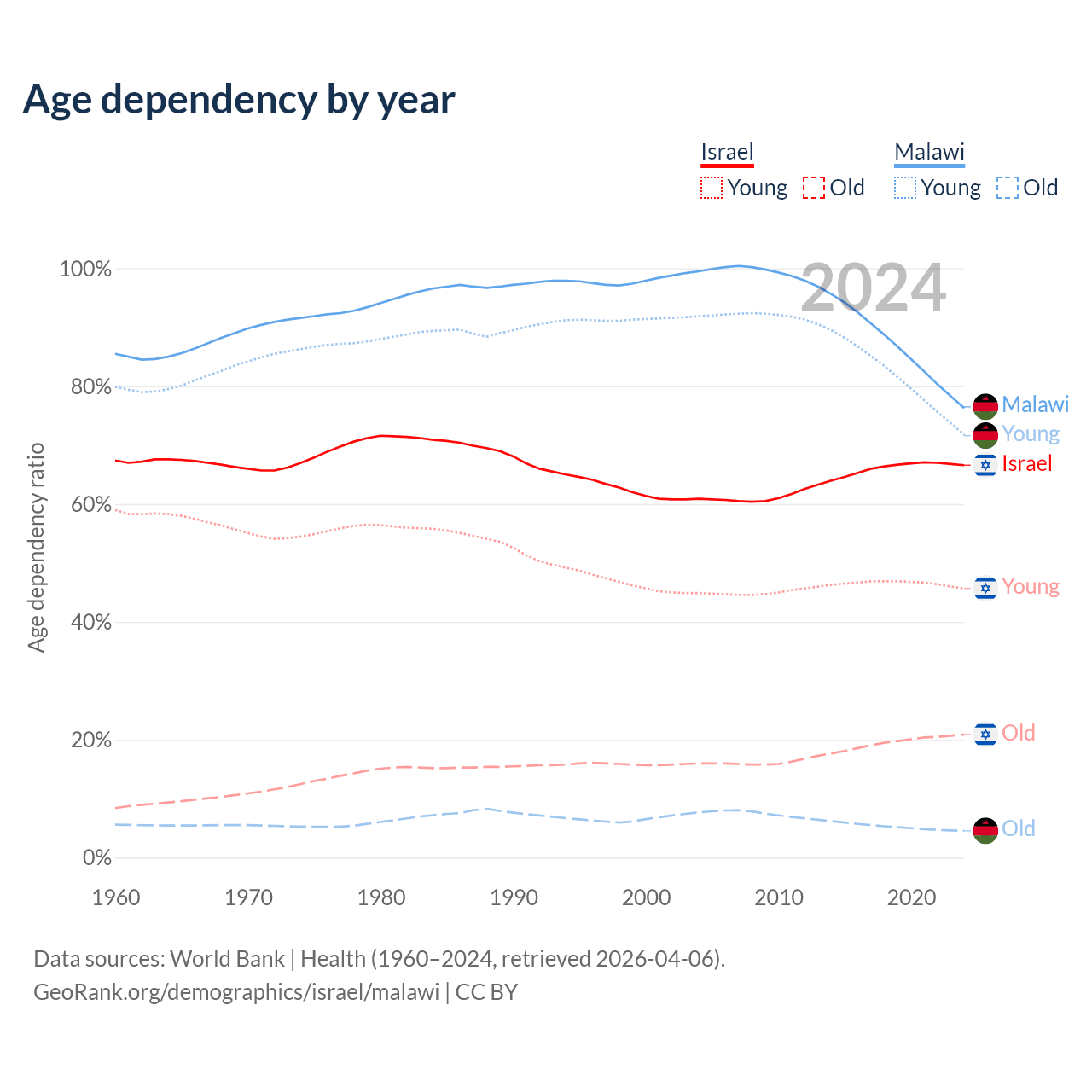 - The share of old-age demographic (65+) in Israel is 12.6% vs 2.59% in Malawi.