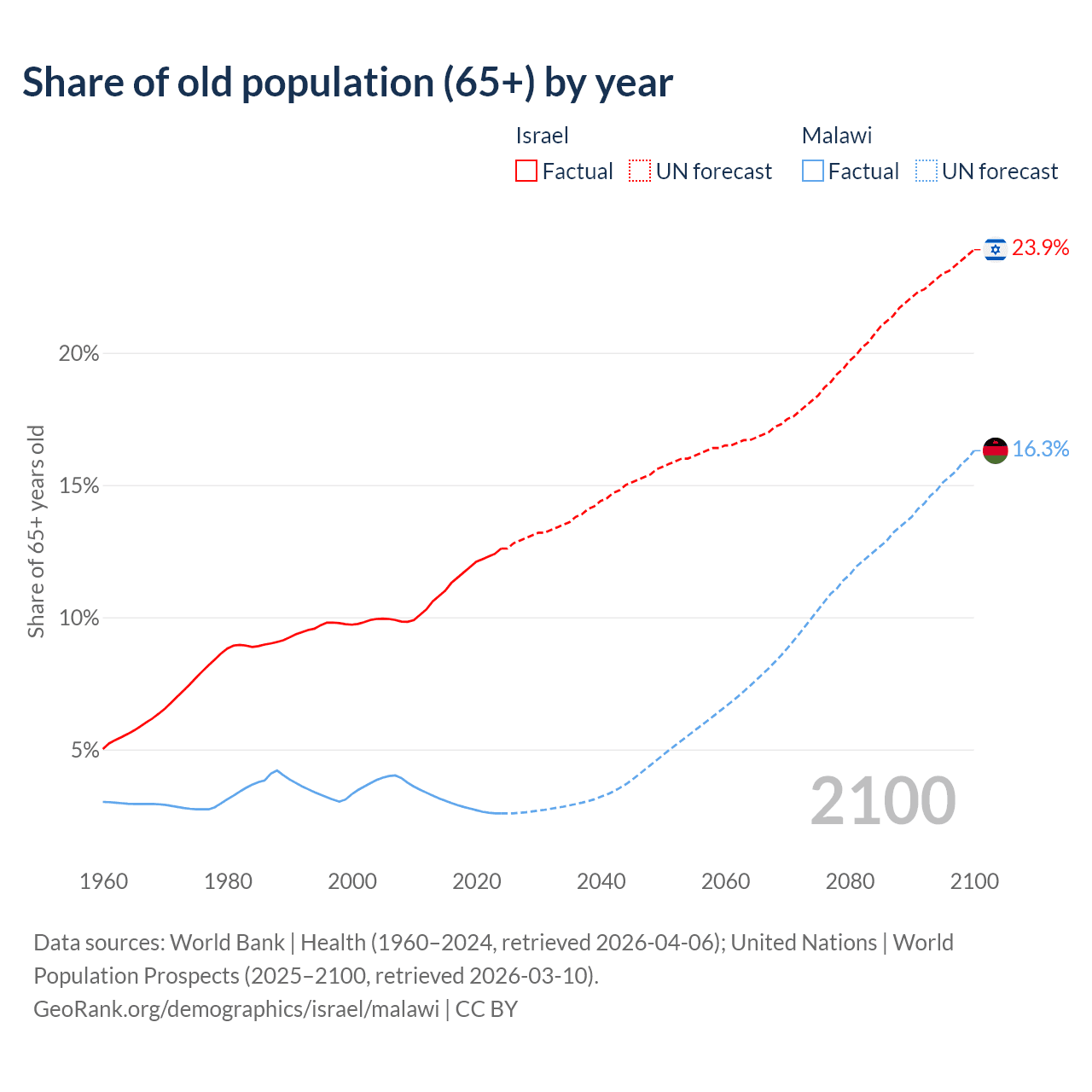 The share of older people aged 65 and over is 12.6% in Israel and 2.59% in Malawi. Life expectancy in Israel compared to Malawi .