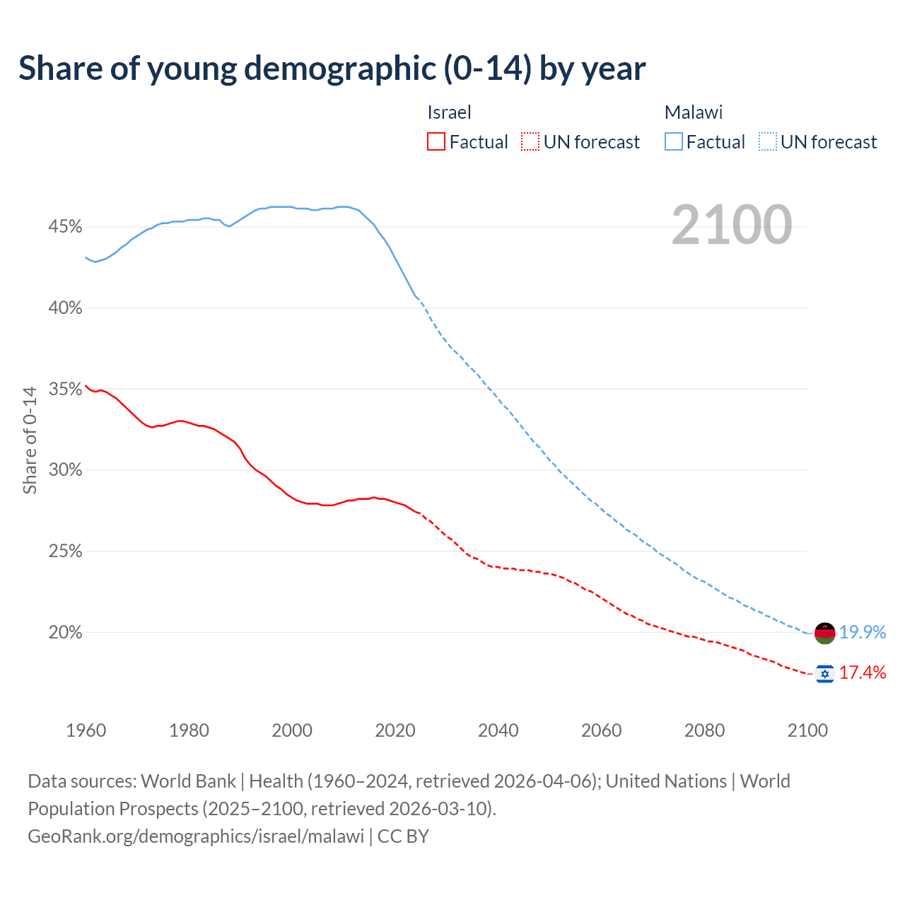 - The share of young demographic (0-15 years old) in Israel is 27.4% vs 40.7% in Malawi.