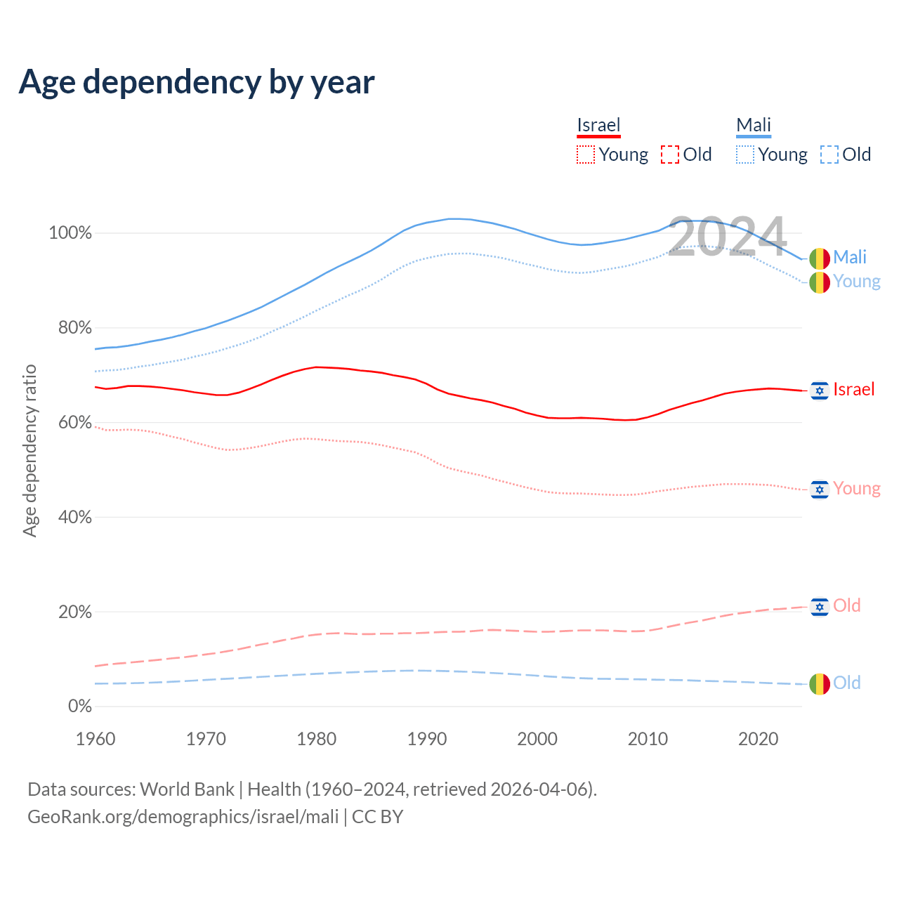 - Israel is ranked 103/196 by median age (oldest to youngest) vs 193/196 for Mali.