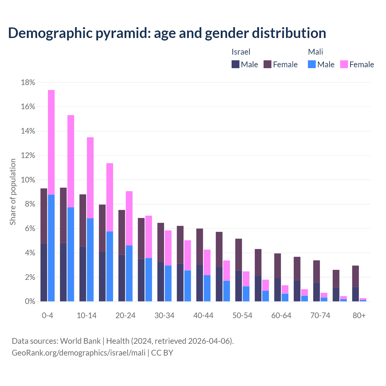 - As of 2026, the population of Israel is 10.3M vs 26.1M in Mali - 2.54 times difference.
