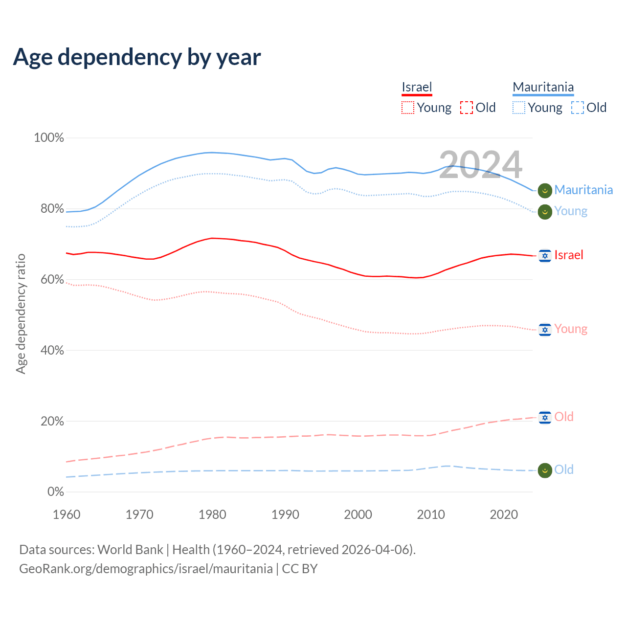 - The share of old-age demographic (65+) in Israel is 12.6% vs 3.23% in Mauritania.