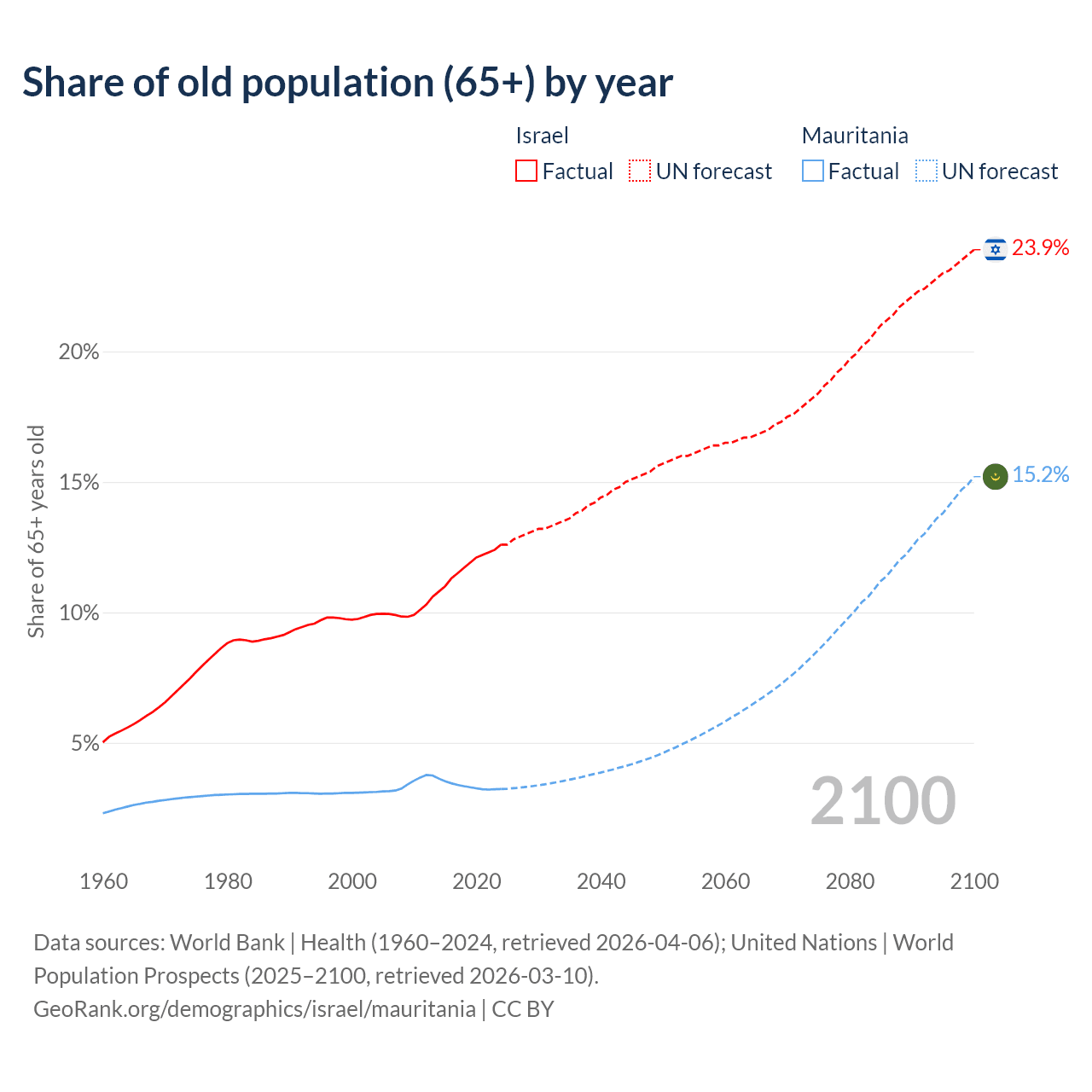 The share of older people aged 65 and over is 12.6% in Israel and 3.23% in Mauritania. Life expectancy in Israel compared to Mauritania .