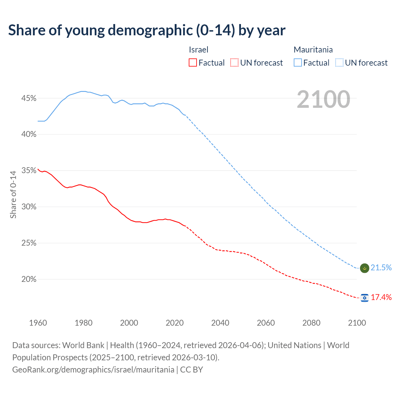 - The share of young demographic (0-15 years old) in Israel is 27.4% vs 42.7% in Mauritania.