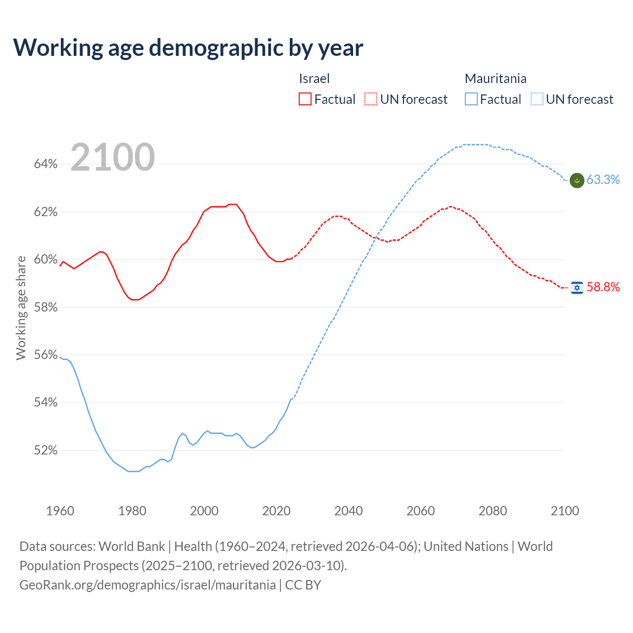 - Israel has 6.18M working age adults (aged 15-64) vs 2.98M in Mauritania.