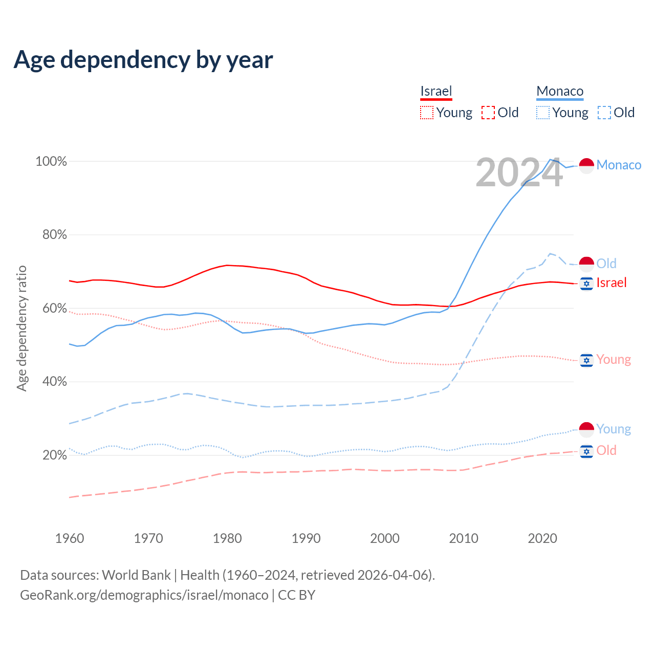 - Israel is ranked 103/196 by median age (oldest to youngest) vs 1/196 for Monaco.