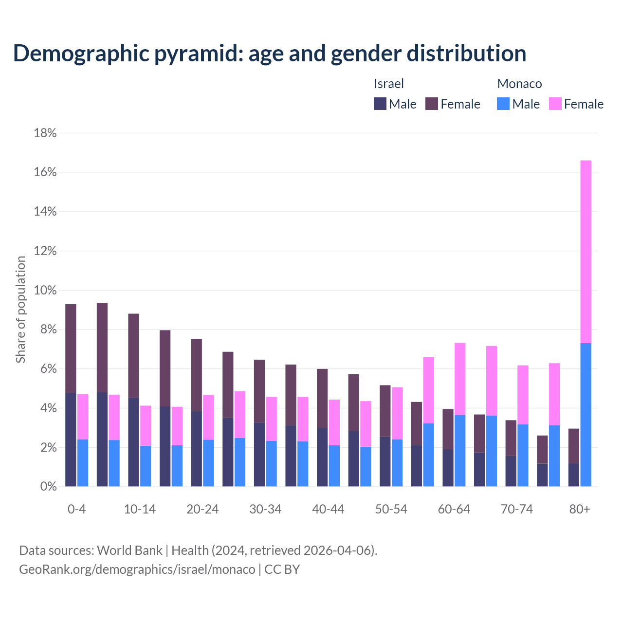 The share of older people aged 65 and over is 12.6% in Israel and 36.2% in Monaco. Life expectancy in Israel compared to Monaco .