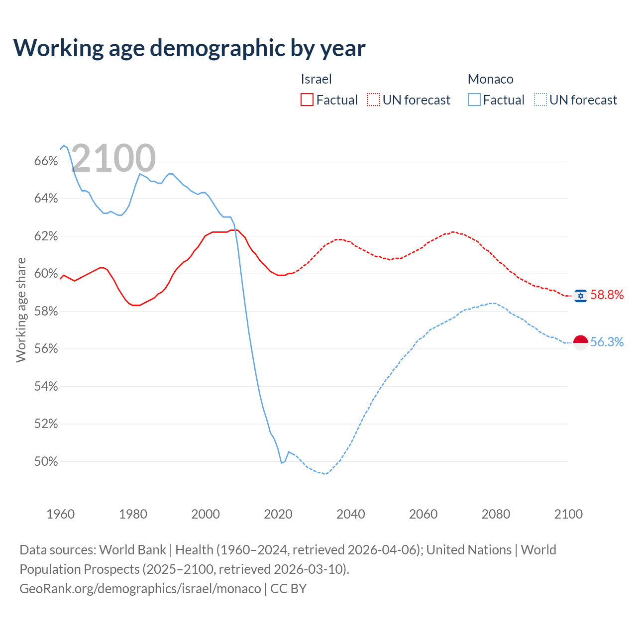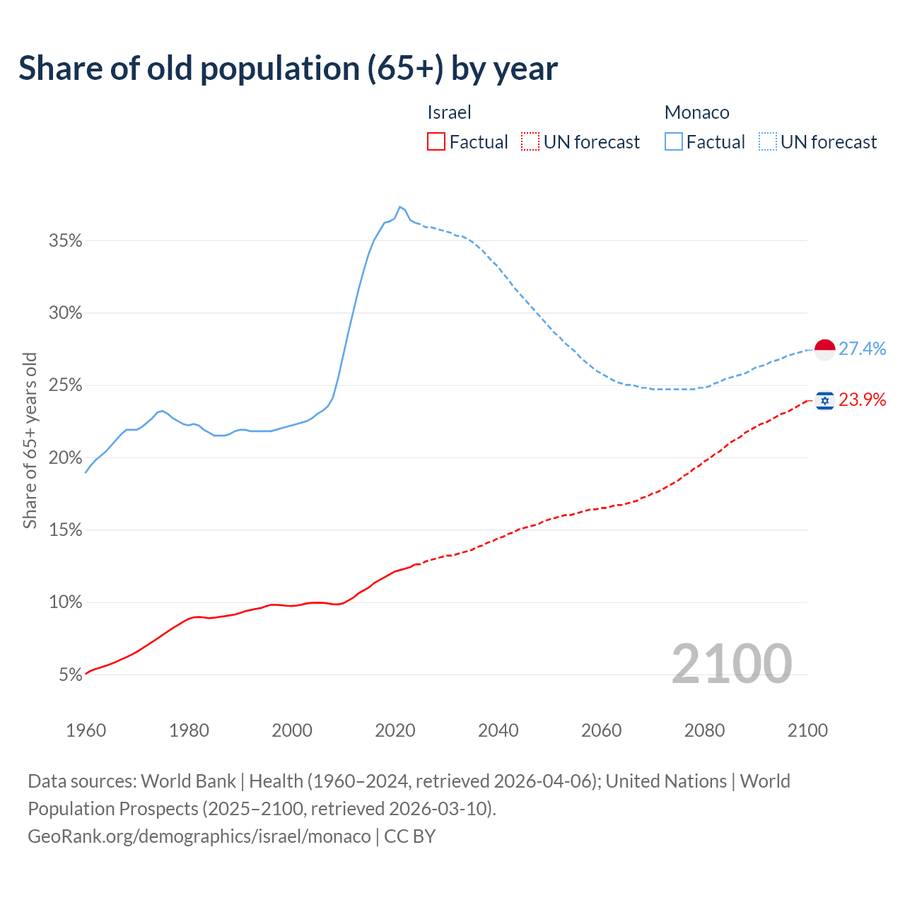 Median age Israel vs Monaco, 1960-2100