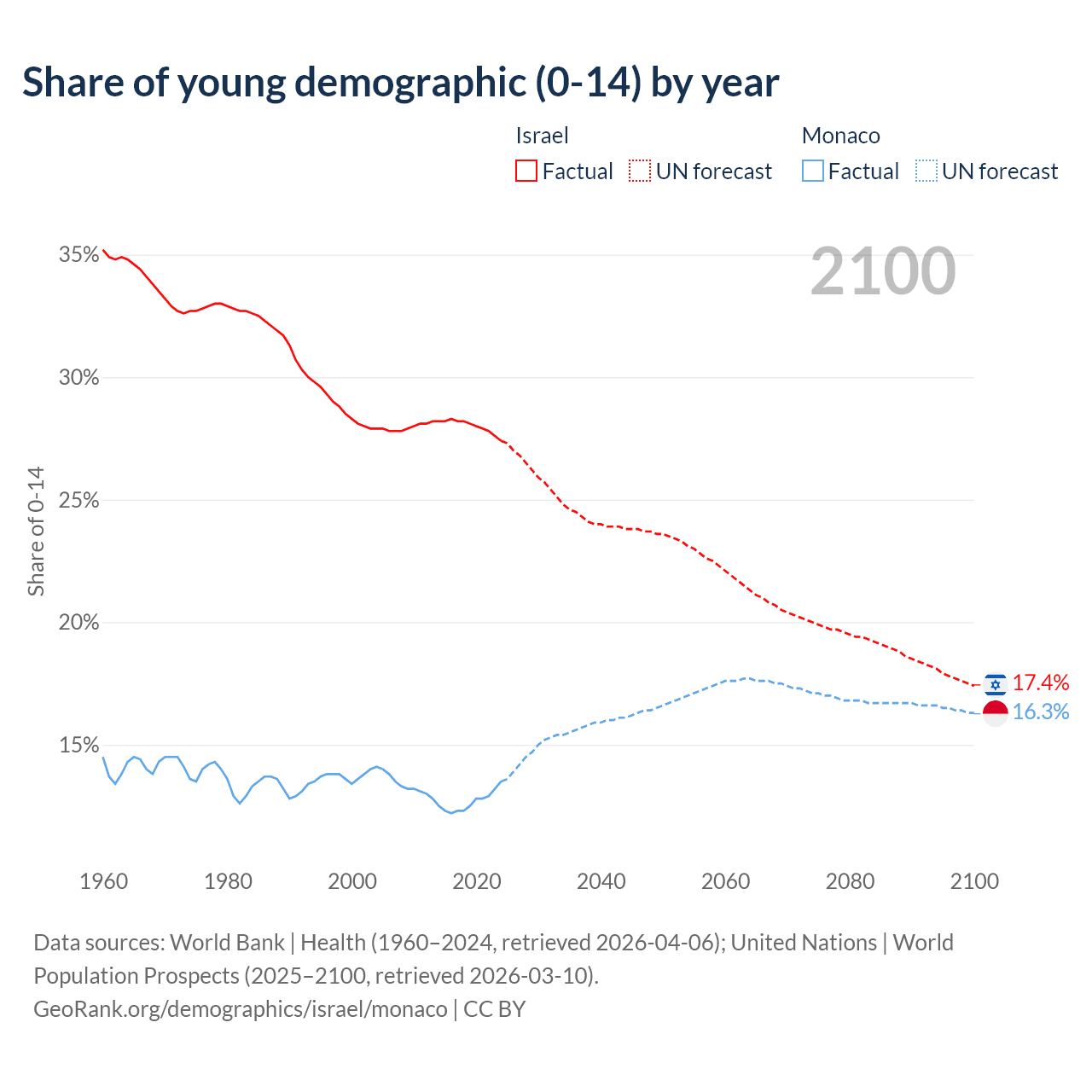 - The share of young demographic (0-15 years old) in Israel is 27.4% vs 13.5% in Monaco.