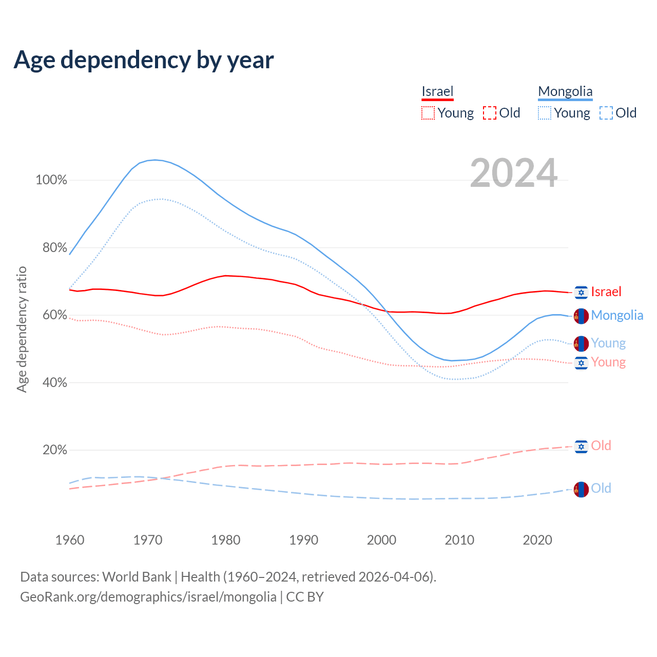 - Israel is ranked 103/196 by median age (oldest to youngest) vs 117/196 for Mongolia.