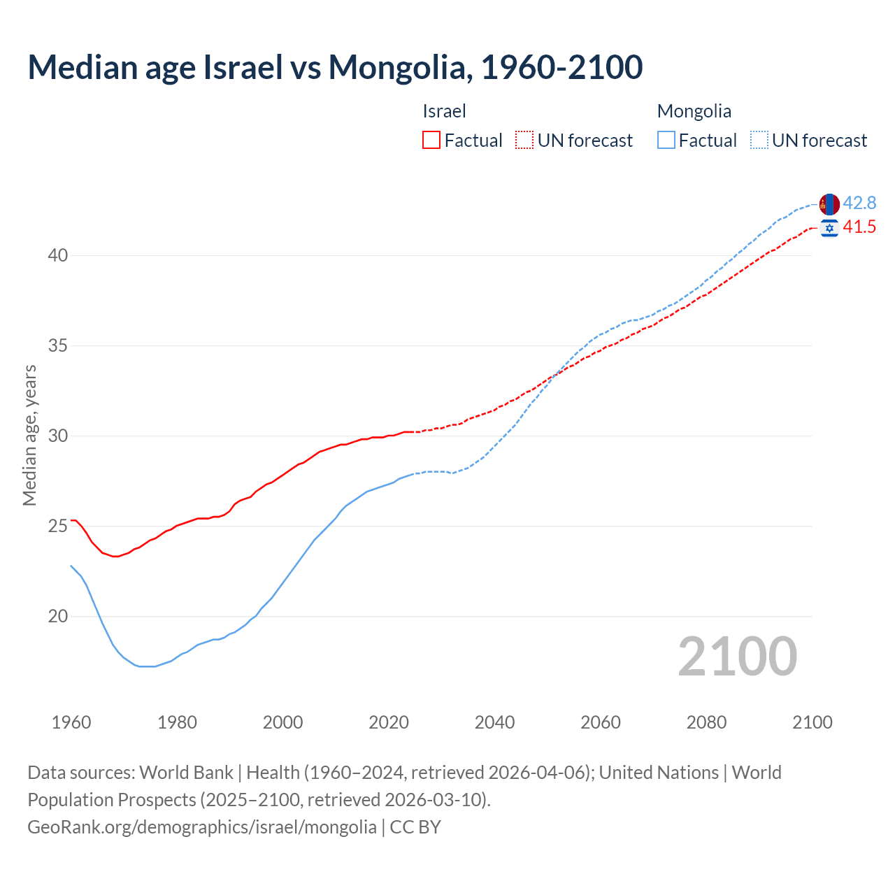 Median age Israel vs Mongolia, 1960-2100