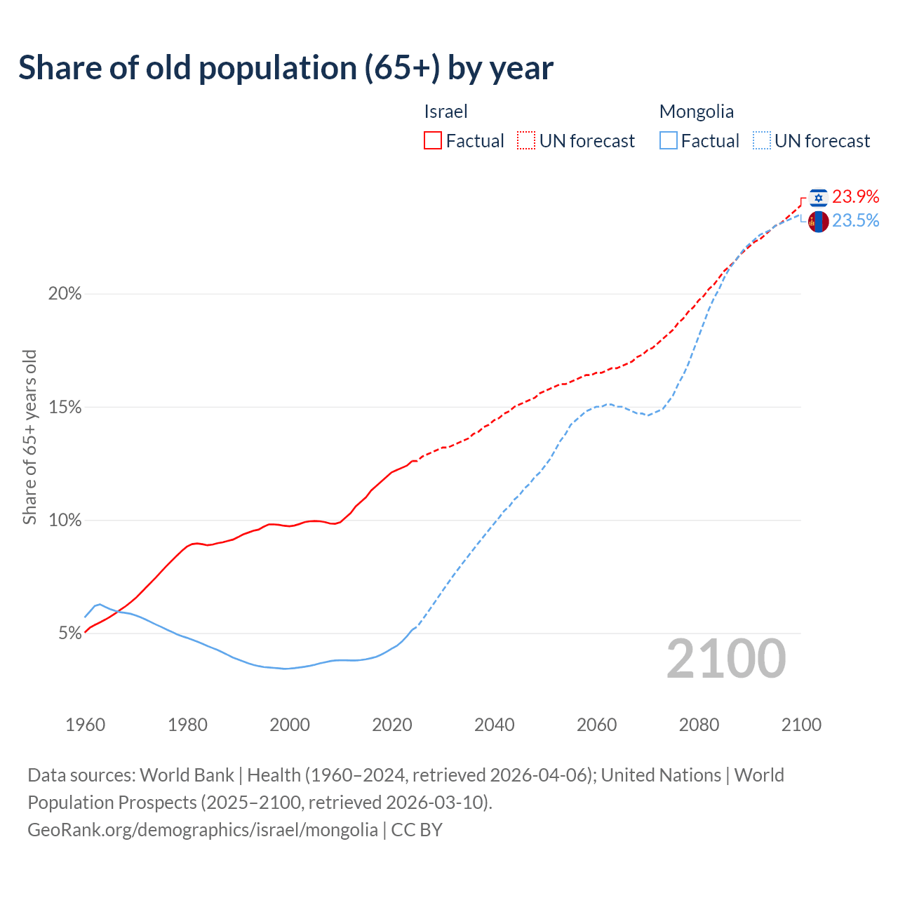 The share of older people aged 65 and over is 12.6% in Israel and 5.14% in Mongolia. Life expectancy in Israel compared to Mongolia .