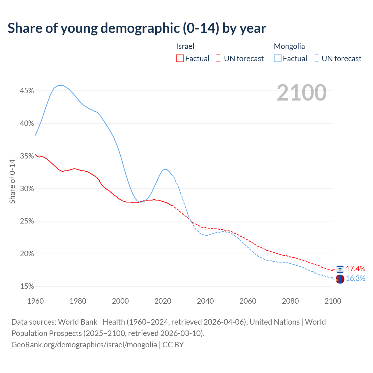 - The share of young demographic (0-15 years old) in Israel is 27.4% vs 32.2% in Mongolia.